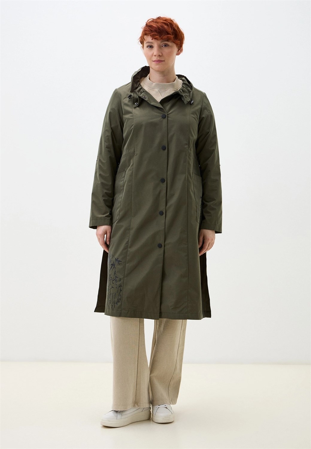 Плащ выполнен из текстиля. Детали: рукава регулируются до длины 3/4 специальной застежкой. По бокам разрезы для удобства при ходьбе. По талии имеется кулиска для уменьшения объема. 2 боковых кармана (на одном из них принтовая отделка).