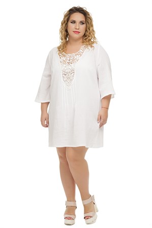 Нежная туника свободного силуэта из текстильного полотна. Круглый вырез горловины оформлен ажурной вставкой на груди, под вставкой застроченные мягкие складки. Рукав втачной 3/4.